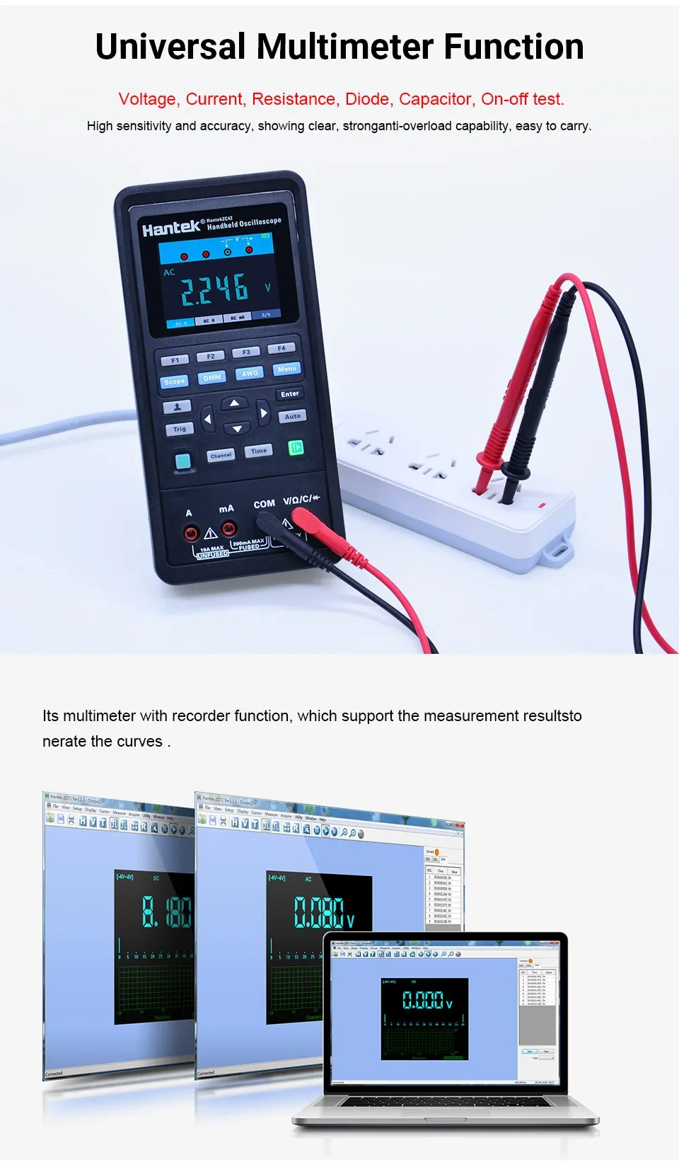 ♦ Universal multimeter function: voltage, current, resistance, diode, capacitor, on-off test;