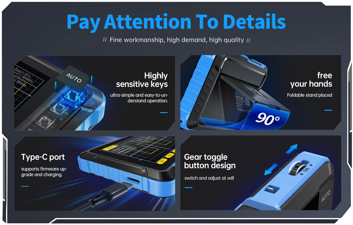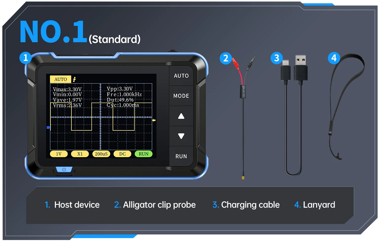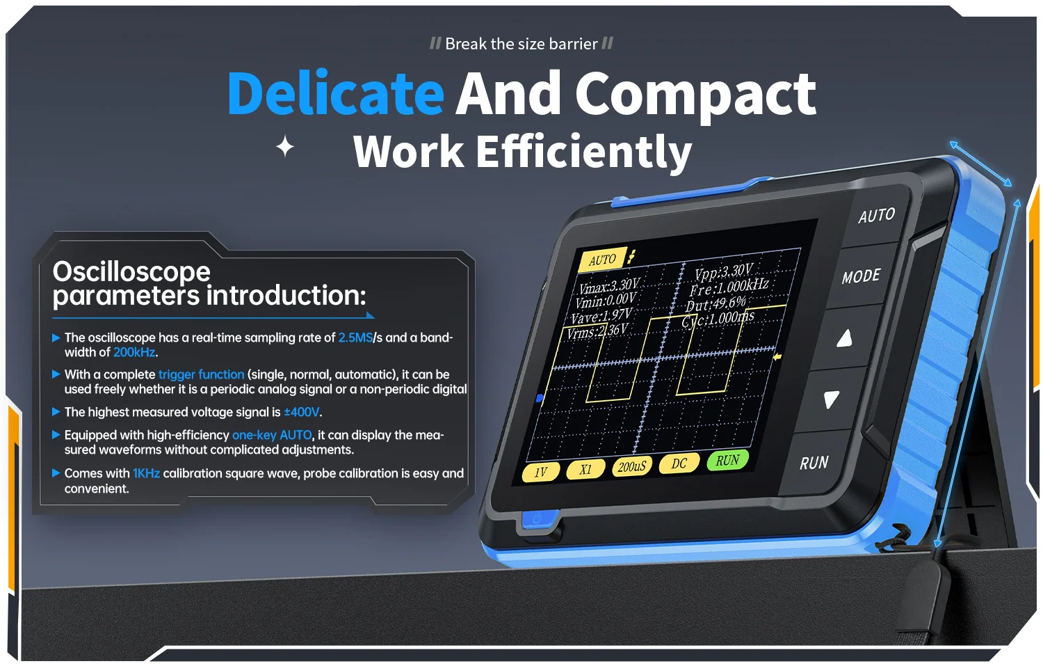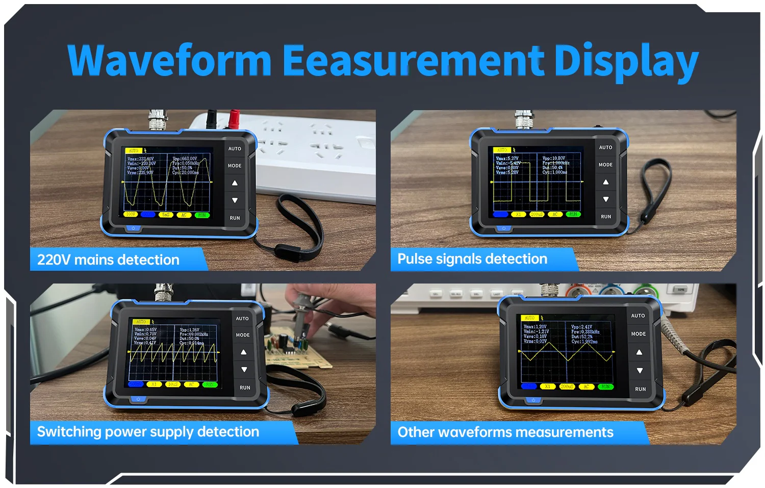 ✦ Mesure facile : Équipé d'un réglage AUTO efficace en une touche de tous les paramètres, la forme d'onde mesurée peut être affichée sans ajustement fastidieux. Appuyez longuement sur le bouton AUTO pour calibrer rapidement la ligne de base, mesure rapide des formes d'onde.
