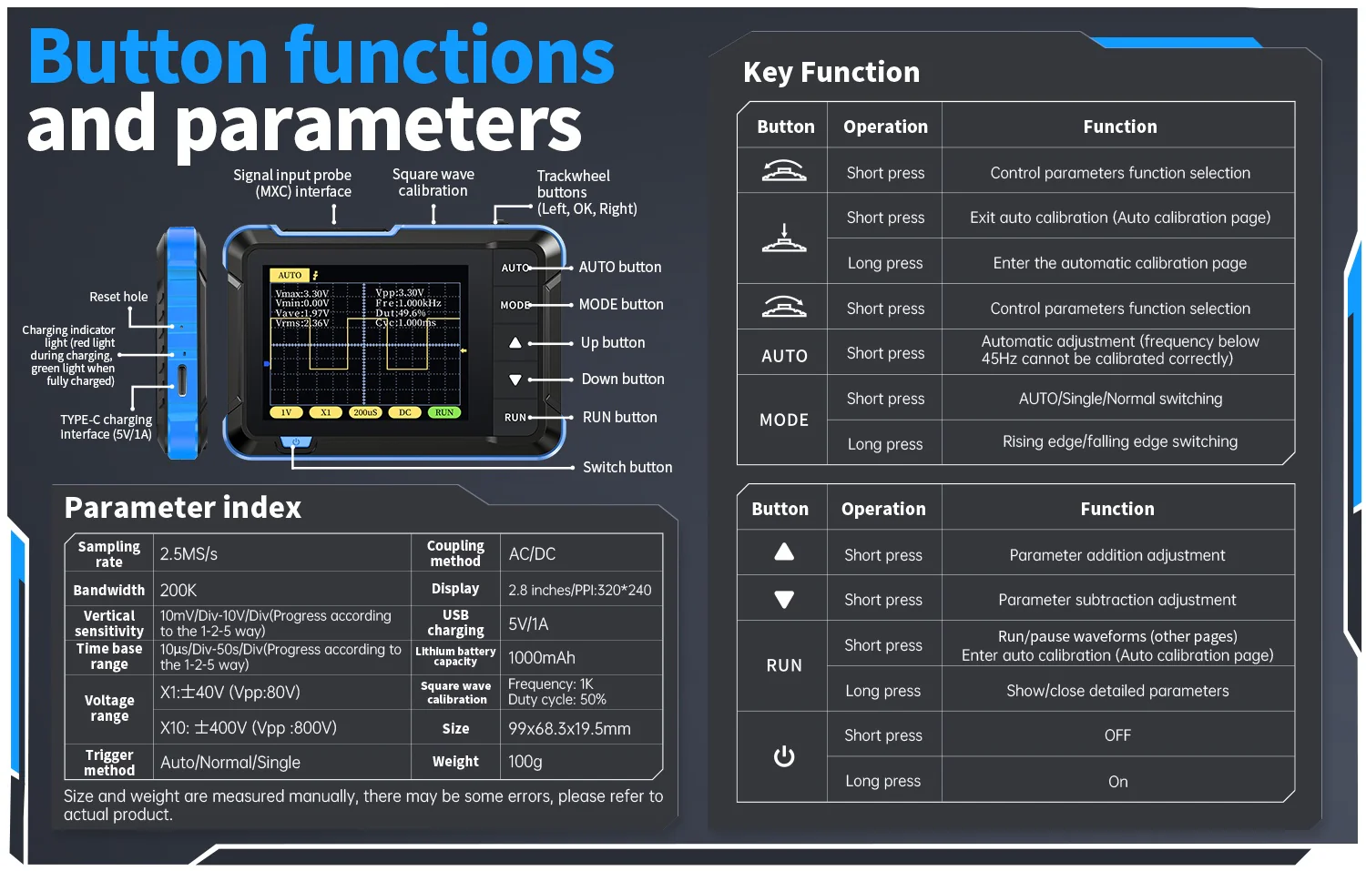 X10:±400V (Vpp:800V)Mode de déclenchementAuto / Normal / SimpleMéthode de couplageAC/DCAffichage2,8 pouces / PPI :320*240Charge USB5V/1ACapacité de la batterie au lithium1000mAhCalibration d'onde carréeFréquence : 1K