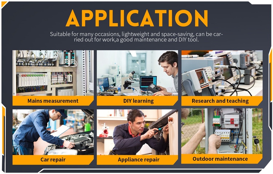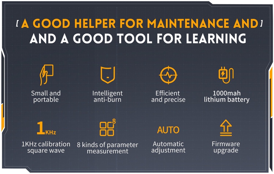 ✦ Easy Measurement: The handheld oscilloscope is equipped with intelligent one-click automatic configuration function. Long press the AUTO button to quickly calibrate the baseline and display the measurement waveform without complicated debugging.