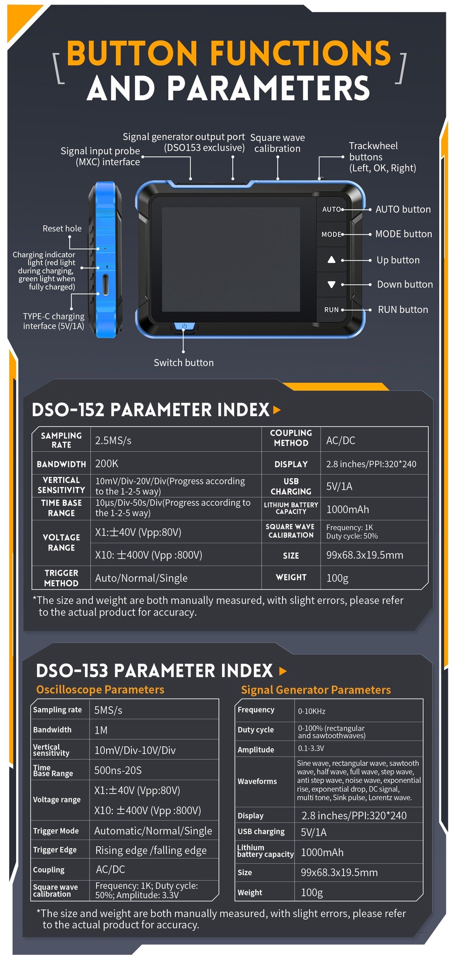 ✦ Upgraded Version: Oscilloscope and DDS signal generator dual mode with 1 MHz High bandwidth, 5MS/s high sampling rate, 500ns-20S time base range, and can measure voltages up to 400V.