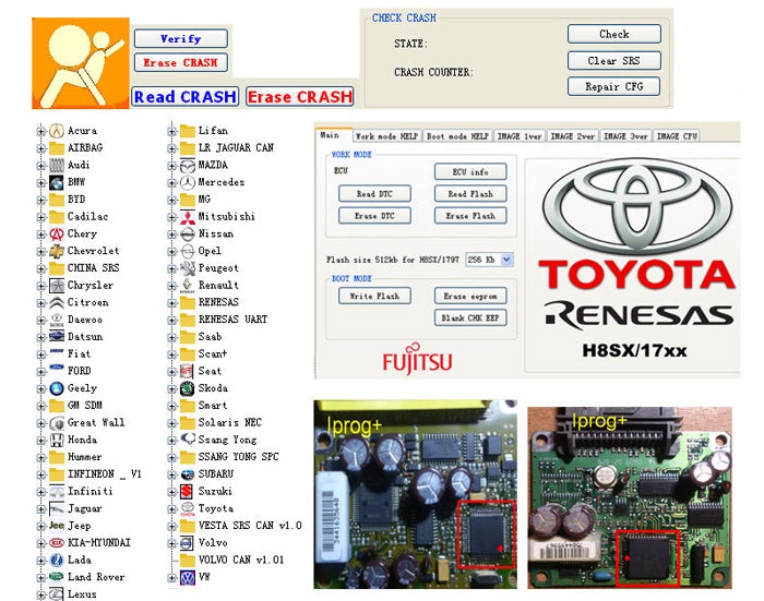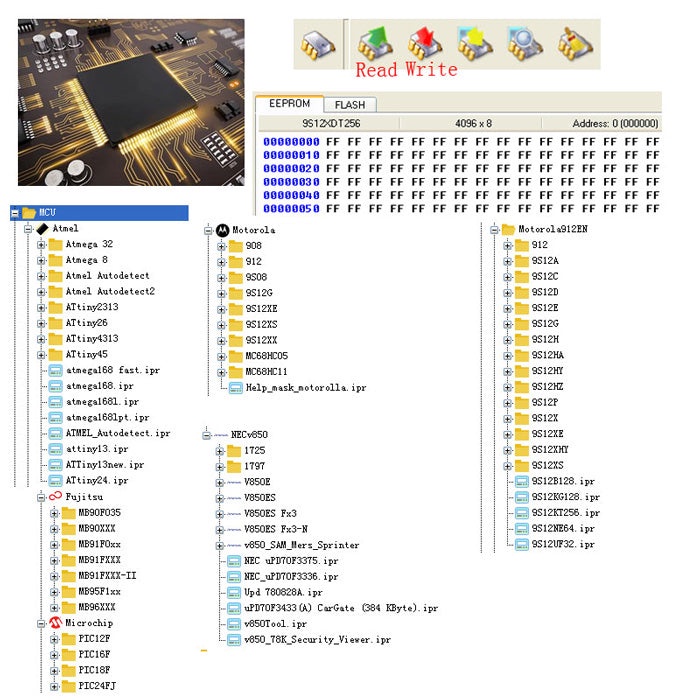 et fonctions spéciales : désactivation du filtre à particules, allumage/extinction, PINABS, code PIN SMATRA3, limiteur de vitesse du capteur de code PIN, réglage de l'odomètre, Fujutsu, Microchip, Motorola, Motorola912EN, NECV890, BLR, CAN, CRC_Cript, ibutton, déverrouillage de carte SD, test, etc.