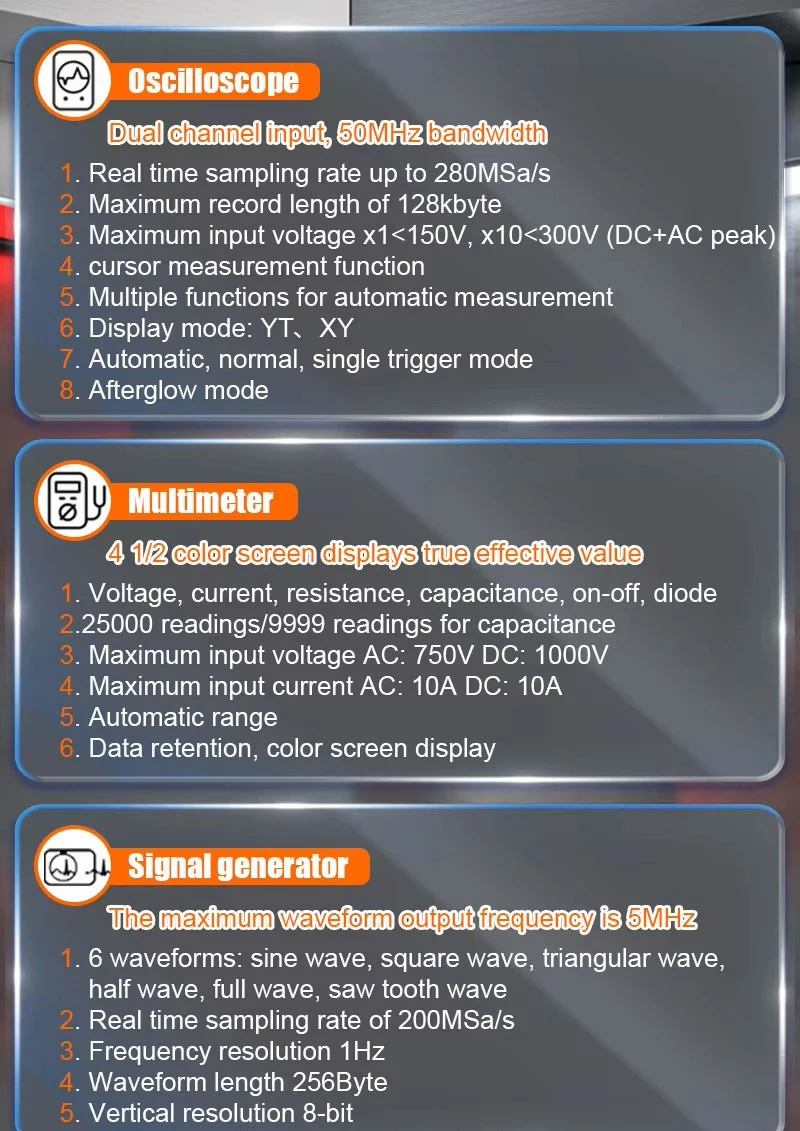 Type d'affichage : Écran numériquenTension AC : 2,5 V/25 V/250 V/1000 VnTension DC : 2,5 V/25 V/250 V/1000 VnCourant AC : 2,5 A/10 AnCourant DC : 25 mA/250 mA/2,5 A/10 AnTempérature de fonctionnement : 0 - 50 ° CnType de batterie : incluse, rechargeablenCapacité de la batterie : 2200 mAhnDimensions : 24*15,5*9 cmnFonctions de résistance de mesure : 250Ω/2,5 kΩ/25 kΩ/250 kΩ/2,5 MΩ/25 MΩ/250 MΩnLargeur de bande (en 3 dB) : VICTOR 152Snnn|Oscilloscope Victor 152s|Oscilloscope Victor|nn**Conception robuste et ergonomique** n Le VICTOR 152S est un oscilloscope de poche conçu pour répondre aux besoins des professionnels des secteurs électroniques. Son design compact et sa construction robuste en font un outil fiable pour les utilisateurs qui nécessitent une performance fiable dans des environnements variés. L'écran numérique de haute qualité assure une lecture facile des résultats de mesure, tandis que la batterie de 2200 mAh rechargeable garantit une utilisation prolongée sans interruption. n n **Performance de mesure précise** n Offrant une large gamme de mesures, le VICTOR 152S est équipé d'une échelle de tension AC et DC, couvrant une gamme de 2,5 V à 1000 V, ainsi que d'une échelle de courant AC et DC, allant de 2,5 A à 10 A. La précision de mesure est renforcée par la capacité de la batterie à rester stable dans une température de fonctionnement de 0 à 50 ° C, ce qui est essentiel pour les conditions de travail. n n **Polyvalence et adaptabilité** n Ce multimètre est idéal pour une multitude de scénarios, des études de cours aux applications de réparation. Les fonctionnalités de mesure de résistance, avec un éventail de valeurs de 250Ω à 250MΩ, permettent une analyse détaillée de divers composants électroniques. La conception du VICTOR 152S, combinant une fonction de mesure précise et une polyvalence, rend l'outil essentiel pour les techniciens et les professionnels de l'électronique.