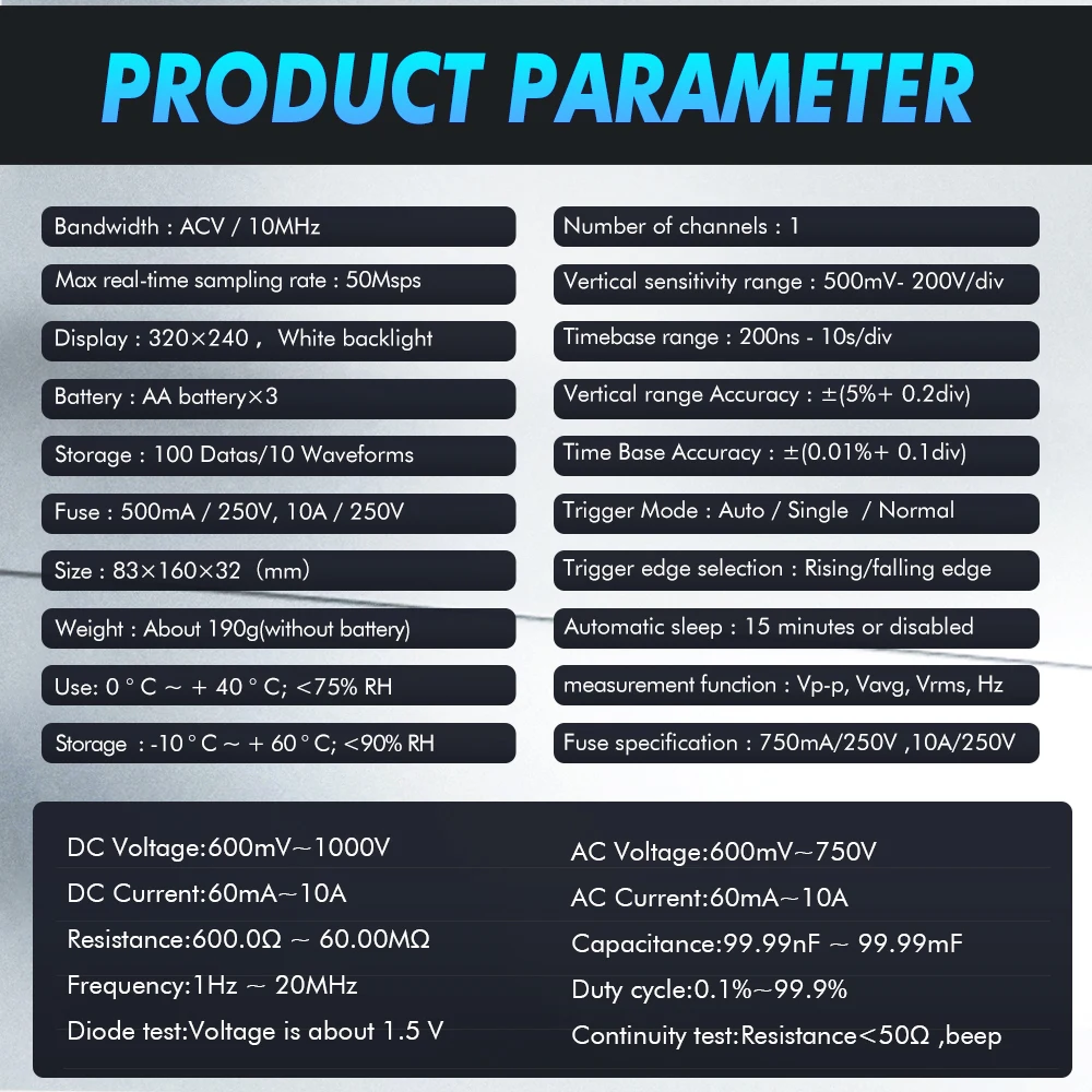 Le taux d'échantillonnage à grande vitesse de 50 Msps peut capturer plus de détails du signal, et la bande passante analogique de 10 MHz vous permet de traiter facilement divers signaux. Avec le multimètre True RMS 6000 Counts.