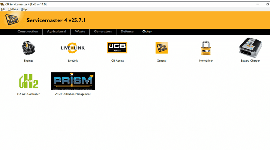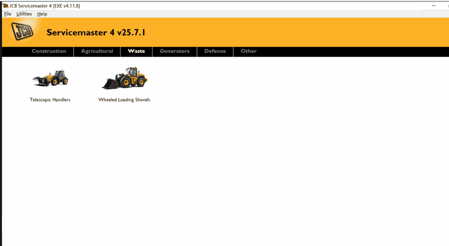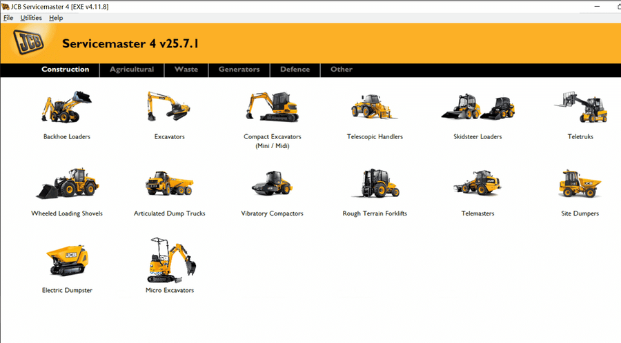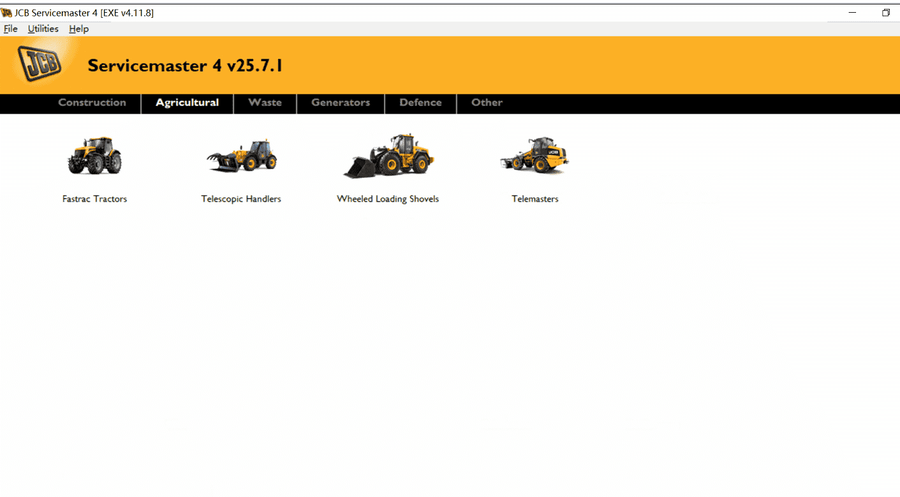 JCB Service Master is a gateway application allowing a large number of Vehicle Support Applications to be linked using one familiar interface. The interface acts as a graphical tool for selecting the target vehicle from a groups of Vehicle Families and triggering the particular Service Tool Application desired. This removes the need for a user to 'remember' every individual service tool available and select which one if intended for a particular machine.