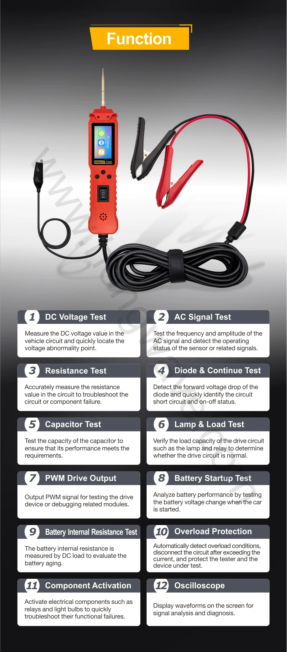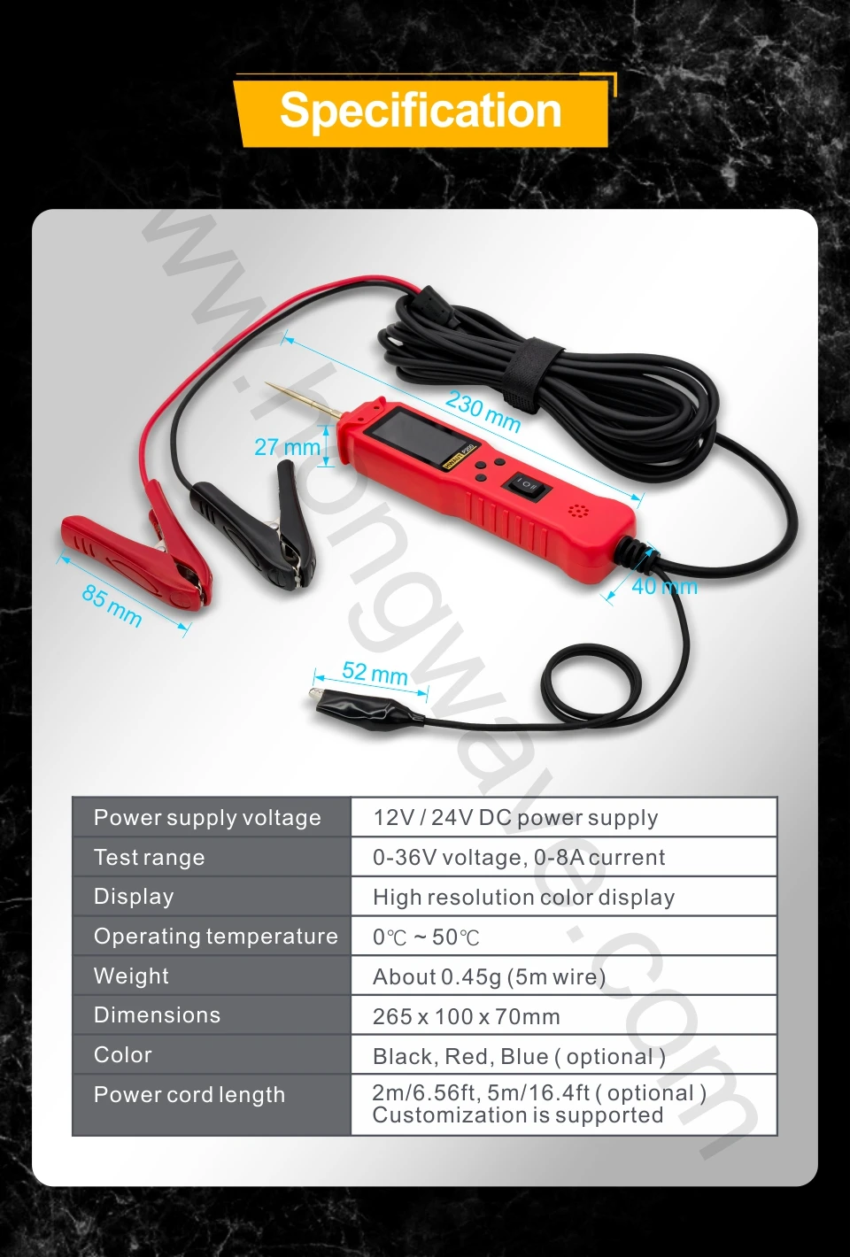 1.DC Voltage Test:Measure the OC voliage value in the vehicie circuit and quick locate the voltage abnermaity point.