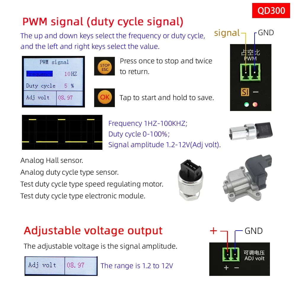 6. Signal Hall avec fréquence de sortie, amplitude et rapport de service réglables. Utilisé pour simuler divers capteurs de cycle de service, tels que le capteur de pression de climatisation (type de cycle de service),