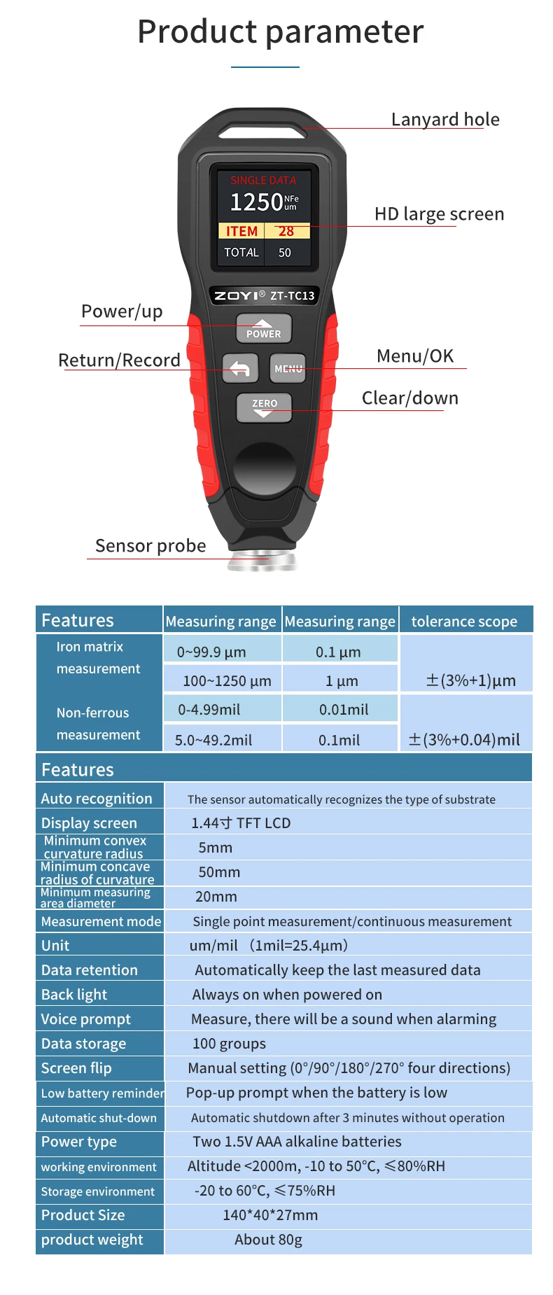 Le ZOYI ZT-TC13 est un instrument de mesure de la couche de peinture de film, conçu pour offrir une précision inégalée avec une résolution de 0,1 microns. Cette précision est cruciale dans les industries de la peinture et de la finition, où une précision de 0,01 mils est essentielle pour garantir la qualité et la durabilité des produits. La fonction de calibration intégrée assure une mesure fiable et fiable, tandis que la capacité de différencier entre Fe (film extérieur) et NFE (film intérieur) est un avantage pour les professionnels du secteur.