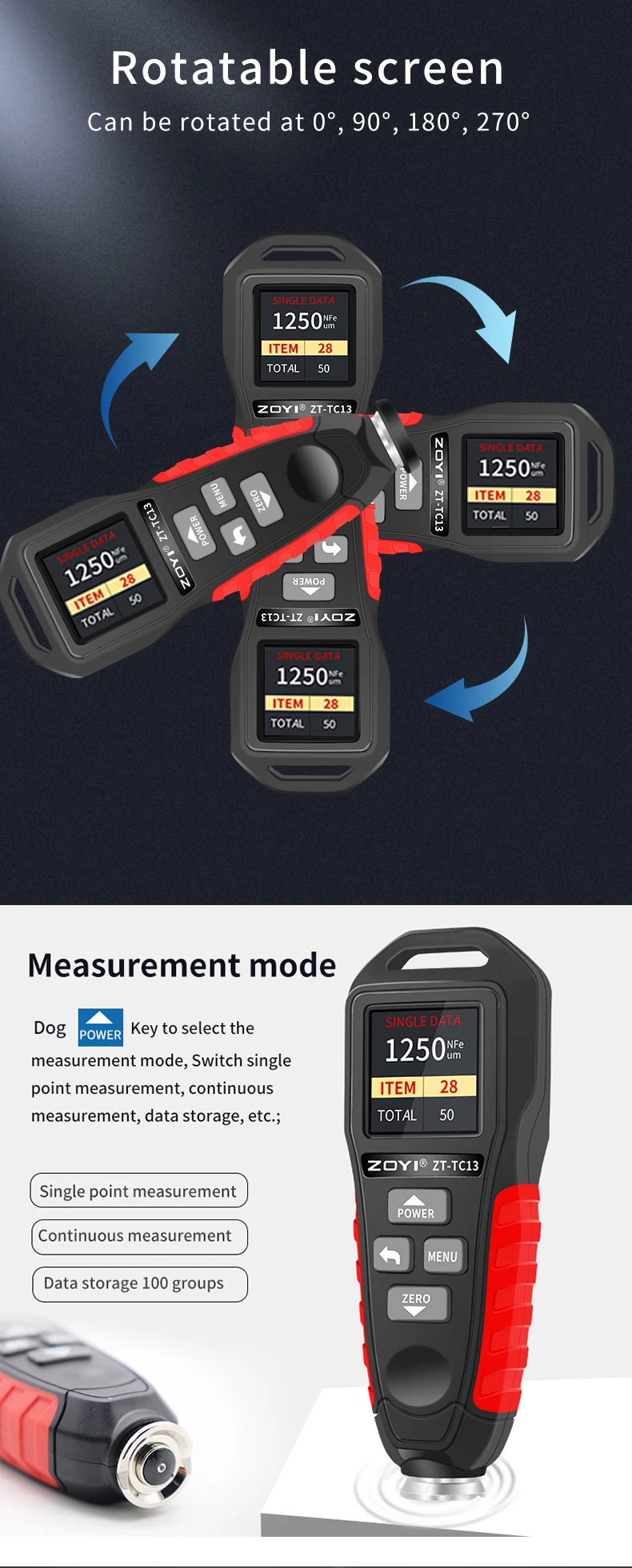 Le ZOYI ZT-TC13 est équipé d'un écran rétroéclairé et d'un écran rotatif, offrant une visibilité optimale et une manipulation aisée dans diverses conditions de travail. La fonction de mesure automatique Fe/NFE permet une analyse rapide et efficace de la couche de peinture, tandis que la portée de 0 à 1250um couvre une large gamme de applications. La conception robuste et les fonctionnalités avancées rendent cet appareil indispensable pour les professionnels exigeants en matière de qualité de peinture.